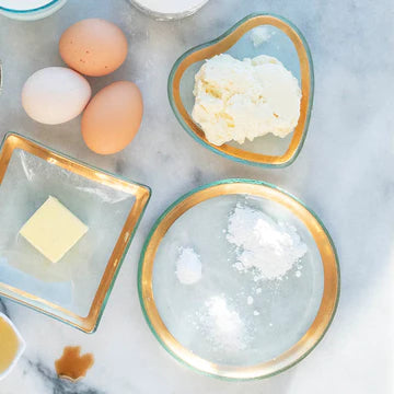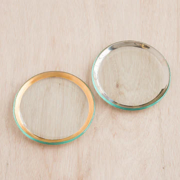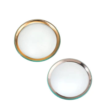 The coupe shaped Annieglass Roman Antique Appetizer Plate is made of durable clear glass and hand-painted with a wide band of 24k gold or genuine platinum. This versatile 6" glass plate can be used at your next informal gathering as an appetizer plate or showcasing pillar candles.