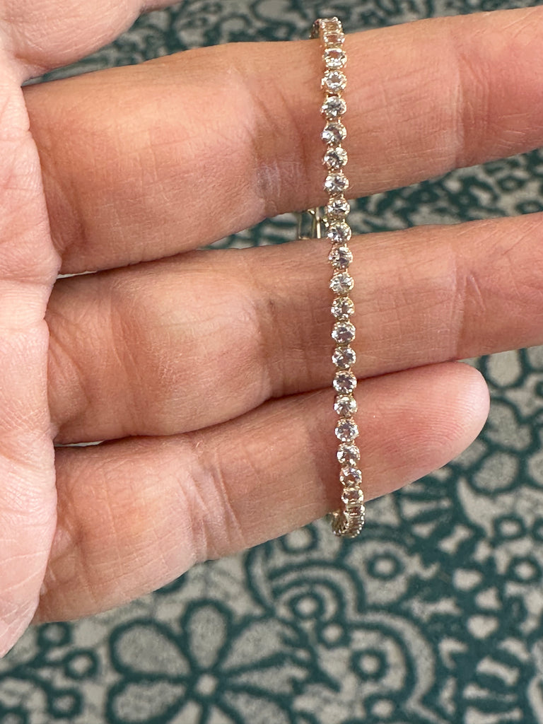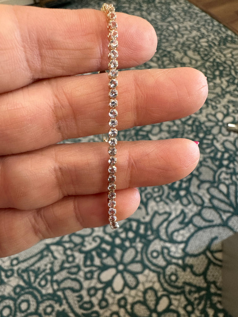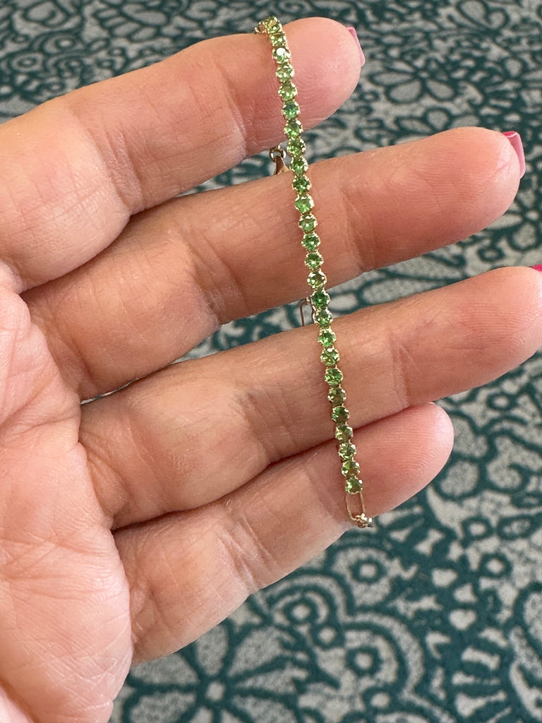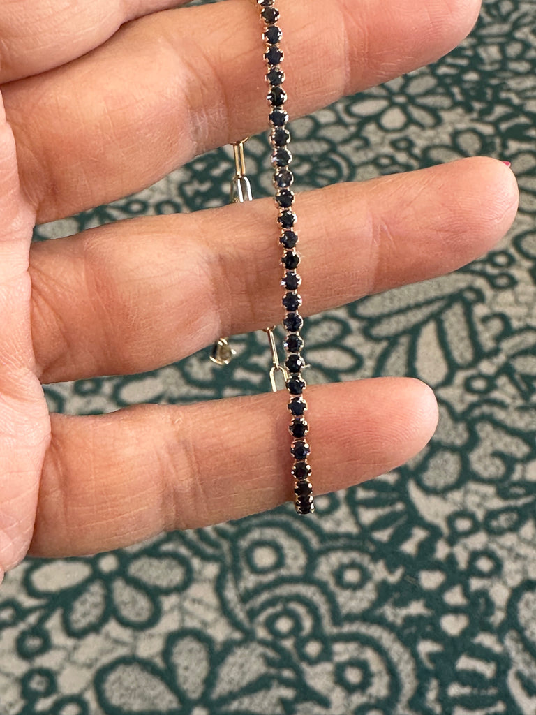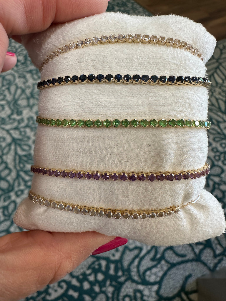 They come in all the birthstones. In stock are blue sapphire, tsavorite, amethyst, white topaz and aquamarine. Set in 14k yellow gold and each is finished with the stone at the end of the bracelet and detail on the clasp.