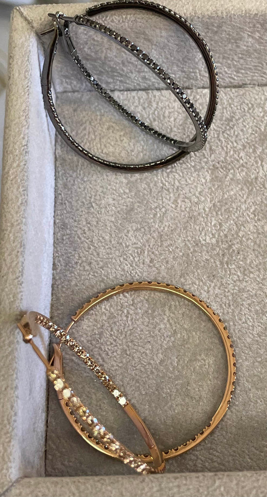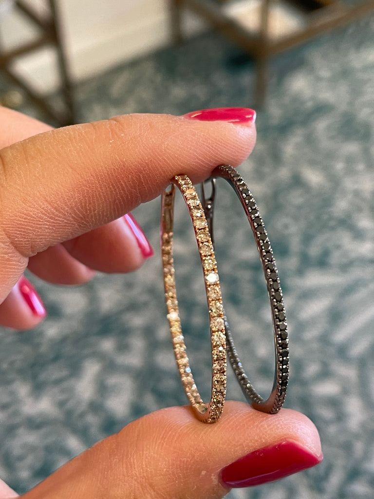 Our best selling hoop! It is 18k rose gold with brown diamonds or 18k Rhodium plated white gold with black diamonds.