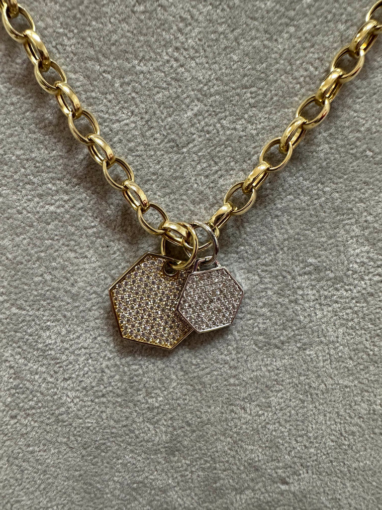 Choose from larger hexagon in 14k yellow gold measuring .5 inch with 2.13 diamonds or 14k white gold measuring .25 inch with .50 diamonds.